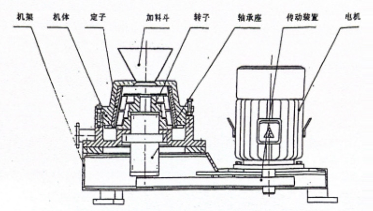 This machine is a turbine type ultrafine pulverizer. It consists of a frame, a machine body, a crushing device, a feeding hopper, a transmission device, and a motor. Its internal structure is shown in Figure 1. The complete set of ultrafine grinding unit consists of a host, a classifier, a high-pressure centrifugal fan, a cyclone collector, and an electrical control cabinet.